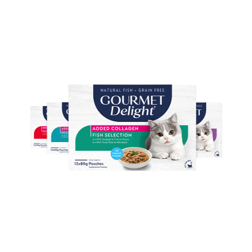Introducing Gourmet Delight with Added Collagen – premium cat cuisine crafted to nourish from the inside out. Each 12 x 80g pouch multipack features tender, grain-free meals made with real meat and fish, enhanced with collagen to support healthy skin, a shiny coat, and overall vitality. Made with natural ingredients and irresistible flavour, it’s a daily indulgence your cat will adore. Because for our feline friends, beauty begins in the bowl.