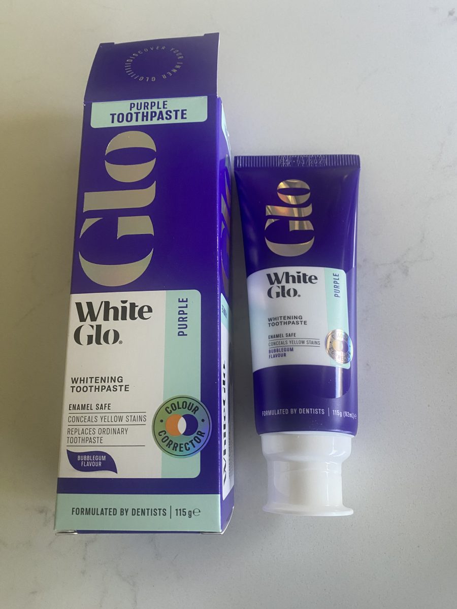 White Glo’s Purple Toothpaste features a specialised combination of red and blue dyes, to make purple colour correctors. These colour correctors instantly conceal yellow stains on teeth enamel. This toothpaste provides instant whitening results, and unlike temporary purple tooth toner solutions, this toothpaste also contains other whitening ingredients including PAP and Hydrogen Peroxide to give a longer lasting result.